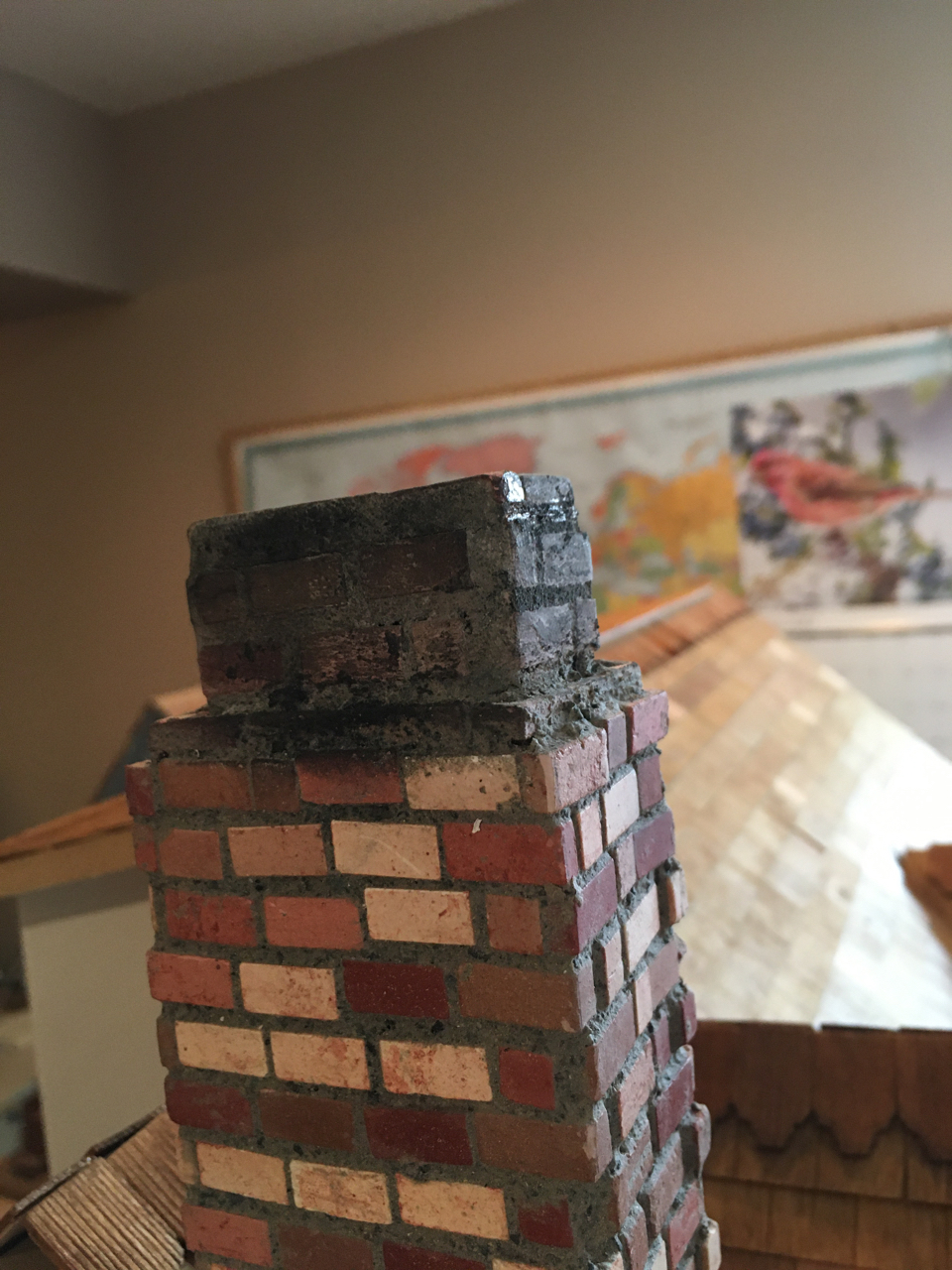 I had two big chores to finish: staining the roof and adhering the trim. I revisited the bloggers and Youtube tutorials that I had searched months ago trying to figure out how to finish the shingles. Some of the shingles came already rippled while others rippled due to the humidity already in our basement due to the evaporation from 3 big aquariums, so I worried that what ever medium I used the thin shingles would warp even more. I tested my shades of wood colored stain gels and paints which caused the thin shingles to curl even more. I just wasn't crazy over the dull finish that these left. Next I tried my pine colored stain