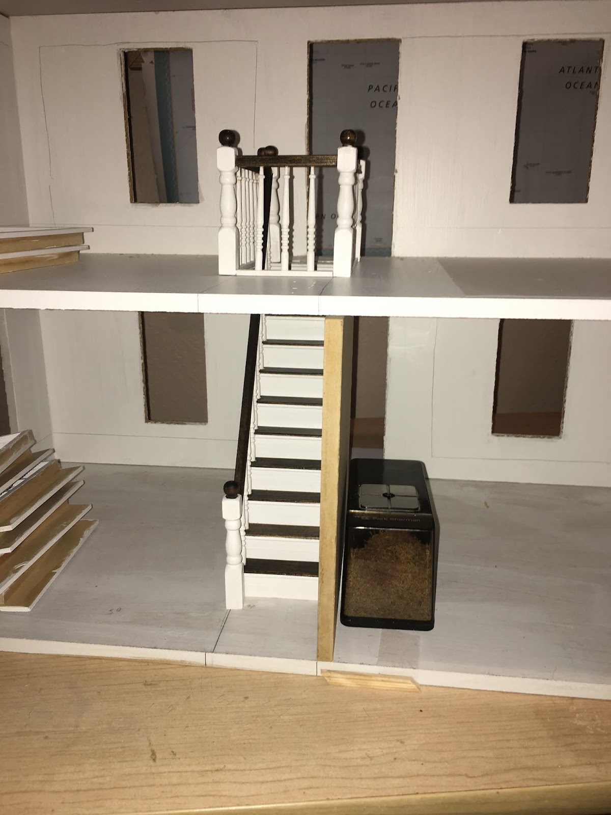 The stair steps are not glued in yet because there is a lot of work left to do. I keep saying that tape wire will go in next--and it will--but first I have to figure where to attach the transformer so that it is out of sight and the base for house has to be fortified and painted and then the I have to attach the base of the addition and the addition to the main house. Won't that be interesting?!