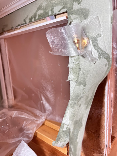 I began by protecting the good surfaces using my favorite kitchen plastic wrap self-sealing product, Press N Seal.