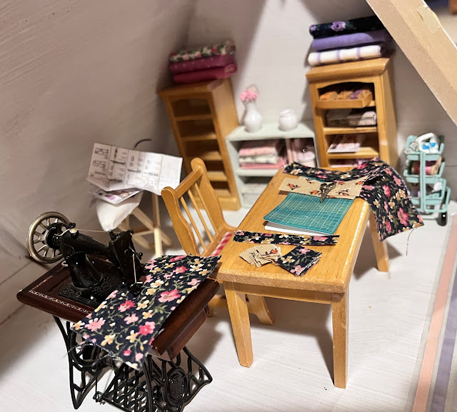 Sewing rooms in miniature are so much fun to create! There are a nice combination of things to make and collect for them, and mixing eras is great because we all have things passed down to us from the older generations in our families! And it is nice to have a nice ice breaker to prepare us for the less fun mini chores like roofing! Have fun jumping back into minis!